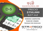 Excelente Terreno Campestre en el exclusivo desarrollo Hacienda Real 1800, en Huichapan Hidalgo. --- UBICADO EN ESQUINA --- 627.80 m2 --- topografía plana Desarrollo totalmente bardeado con acceso controlado --- urbanizado ---- con toma de agua potable y acometida eléctrica. --- Escriturado y con predial pagado hasta el 2025 --- Precio de oportunidad: $750,000 --- se acepta trueque del 50% por automóvil a precio de libro azul y sin deudas -- o 3 pagos de $250,000 --- El desarrollo ofrece hermosas amenidades -- Hotel-hostal, casa club, restaurante, capilla, lienzo charro, albercas abierta y techada, juego infantiles, lago para pescar, reserva de animales protegidos, amplios jardines, caballerizas, canchas de tenis, calles empedradas, entre otros (ambiente 100% familiar).